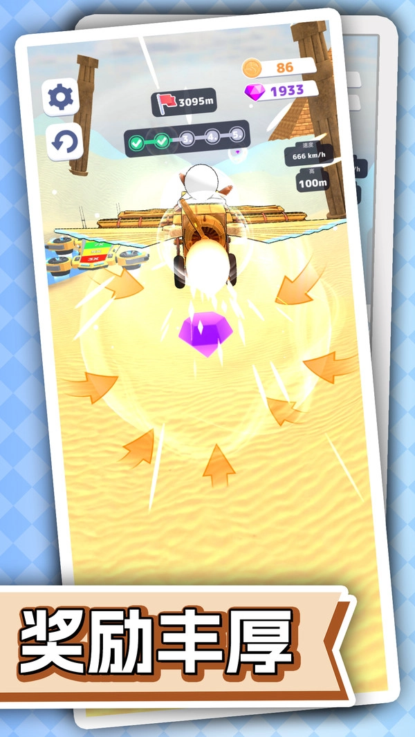 2、操控组装完毕的飞机,穿梭于雪地、沙漠等多样场景之中,巧妙躲避各类障碍,沿途收集奖励,向着最远飞行距离发起挑战。