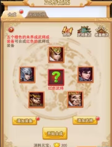 通关到第45关后,您将开启武将合成的功能。五个橙色武将可以合成一个红色武将,不过要特别注意,用来合成的武将必须是未养成过的。如果您的橙将已成为您的上阵武将,那么您需要先将其下阵,再进行武将重生。