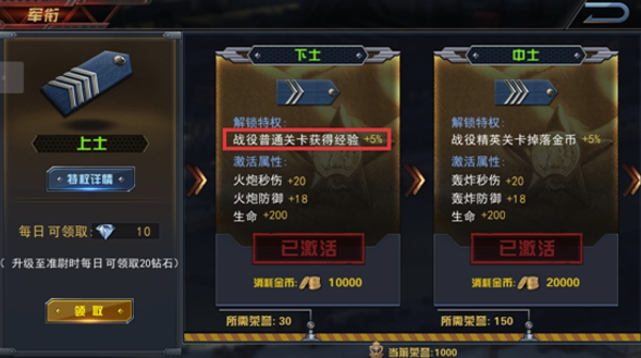 在游戏中有个“军衔”系统,这个系统会给玩家提供各种加成。比如经验、金币、每日可购买金币数、每日可购买原油数等。玩家别忘了提高荣誉值,以获取这些加成。