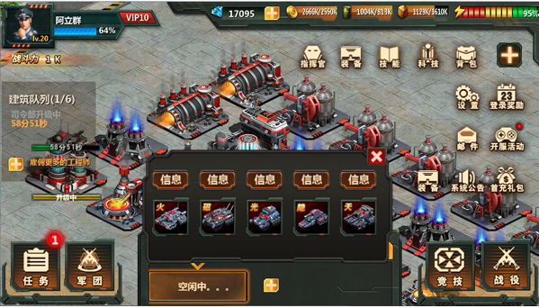 右上角:钻石、金币、石油、铜矿、登录奖励、开服活动、首冲礼包等;