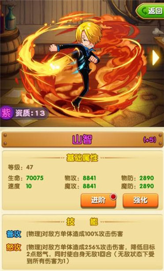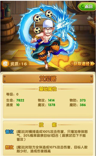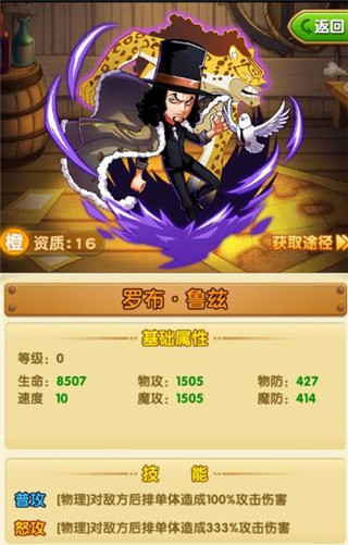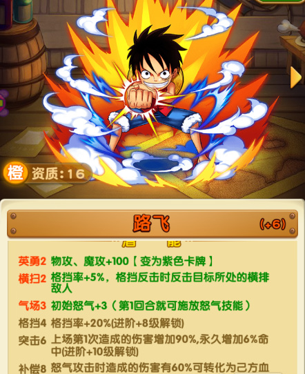 2、次选路飞,路飞的各种格挡闪避免疫回血回怒,宝物也好出,另外还是情怀党的情怀。唯一的缺陷就是人物碎片,过图也不是很给力,听其他玩家说过,过小花园花了五天很考验人的耐性,前四天得探索纯属经验,怪物打不动,多打几次又浪费体力,紫首饰也没一个。