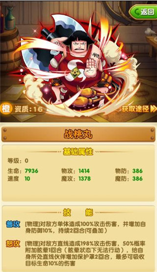 3、阵容点评:战桃丸的眩晕控场(宝物25有70%眩晕)+撒谎布的百分百眩晕,一回合晕3个。罗布+甚平+撒谎布的强力秒后排。一般后排都是辅助和奶,所以火力集中优先秒杀。所有卡都可以突破。过图PK强力。