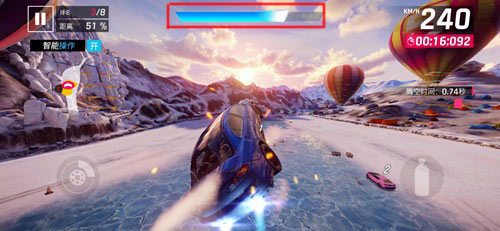 在屏幕上方有一条氮气管,当我们漂移、撞毁对手、腾空、收集氮气瓶等都可以获得氮气增加,逐渐续满氮气管。