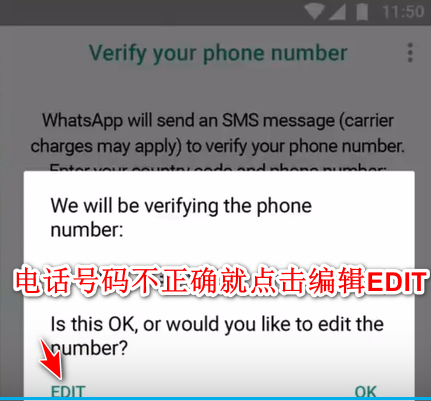 5、电话号码如果输入有误,点击EDIT,重新编辑电话号码;