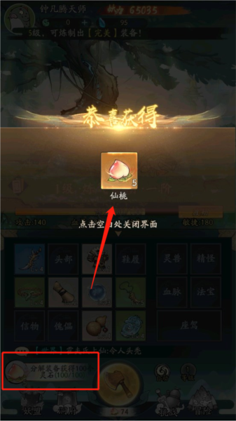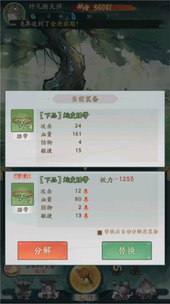 3、物品有不同的等级,当我们获得等级更高的物品时,我们可以选择装备等级更高的物品,这也可以提升我们的妖力。替换完等级高的物品后,可以分解等级低的物品,物品分解后会增加我们的修为并且获得一定数量的灵石。