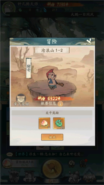 5、除了砍伐灵树之外,到达2级后,就可以开启冒险模式了。冒险模式胜利可以获得一点数量的仙桃和仙玉或者净瓶水,仙玉可以用在坊中购买道具,净瓶水可以加速灵树等级的提升。