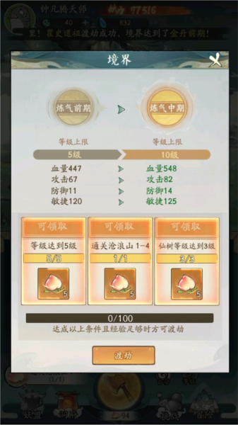 6、等级到达5级后便可以进行渡劫,渡劫可能会失败,失败后会获得一定数量的仙桃,如果想要继续渡劫就需要继续砍伐灵树将修为练到100再进行渡劫,渡劫成功后会从练气前期到练气中期,并且可以继续提高等级。