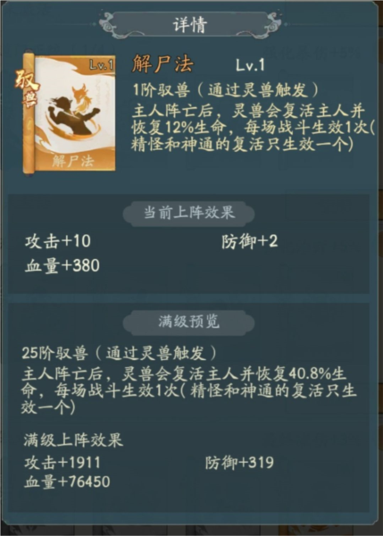 驭兽:尸解法。复活保命,死亡也可以触发勾陈效果,可以打死后起来闪避后又快满血了。