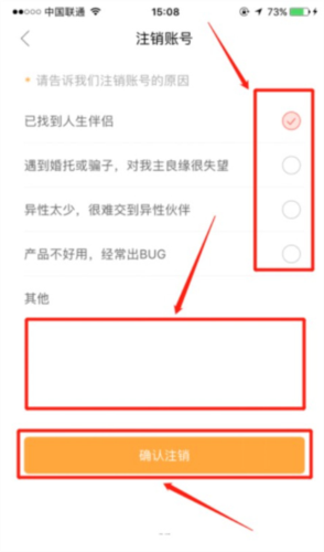 5、勾选注销账号的原因,可填写相关描述,填写完毕点击“确认注销”按钮,完成我主良缘个人信息注销。