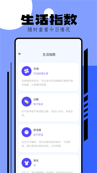 用户可以随时查询空气质量、穿衣指数、运动指数等生活信息,方便用户进行日常生活计划和调整。