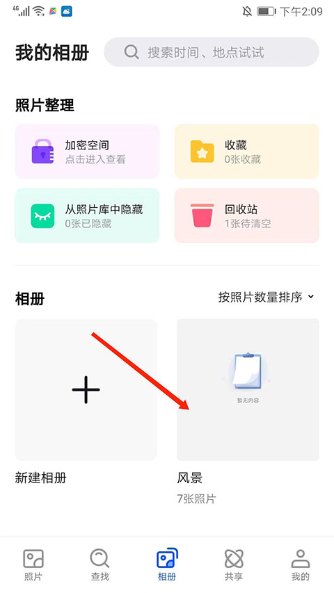 2、进入我的相册界面,在相册栏目,选择需要导出的相册分栏,这里以“风景”为例。