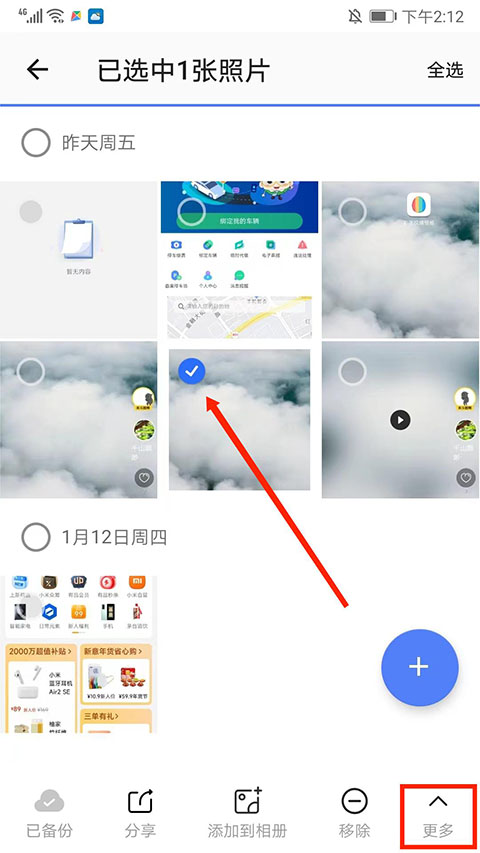 3、进入相册分栏界面,勾选好照片后,选择右下角“更多”选项。