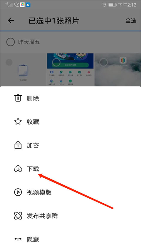 4、弹出“删除”、“收藏”、“加密”、“下载”等功能,此处选择“下载”,即可成功导出照片。