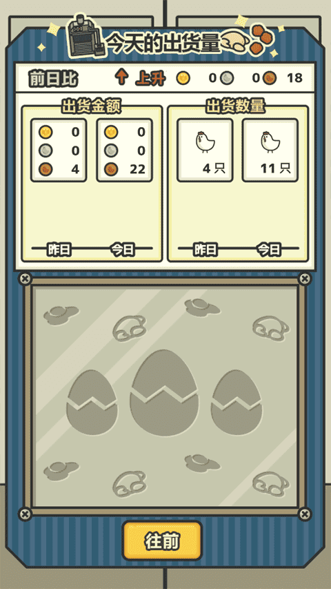 3、游戏本身有着昼夜循环系统,白天为生产时间,持续三分钟,在这短短的三分钟里,你可以点击一下使机器工作时间缩短10秒,使小鸡更快成长更快卖出去赚更多的钱。同时你还可以放生价格低的鸡让昂贵鸡种进到鸡栏里生蛋。三分钟结束后还会跳出营业报告,告诉你总共卖了多少只鸡赚了多少钱,还会和昨天进行对比,可谓是十分励志了。