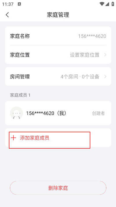 3、点击添加家庭成员,就可以通过输入家人手机号邀请家人进入