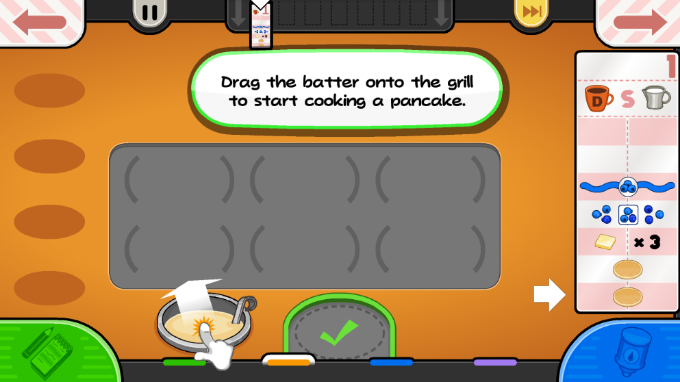 4、在煎饼的时候要看好火候,当煎饼右侧能量条到达一半的时候,点击一下煎饼,让它们翻面继续煎。当两面都煎好以后,按住煎饼拖到右边订单下面的盘里即可。