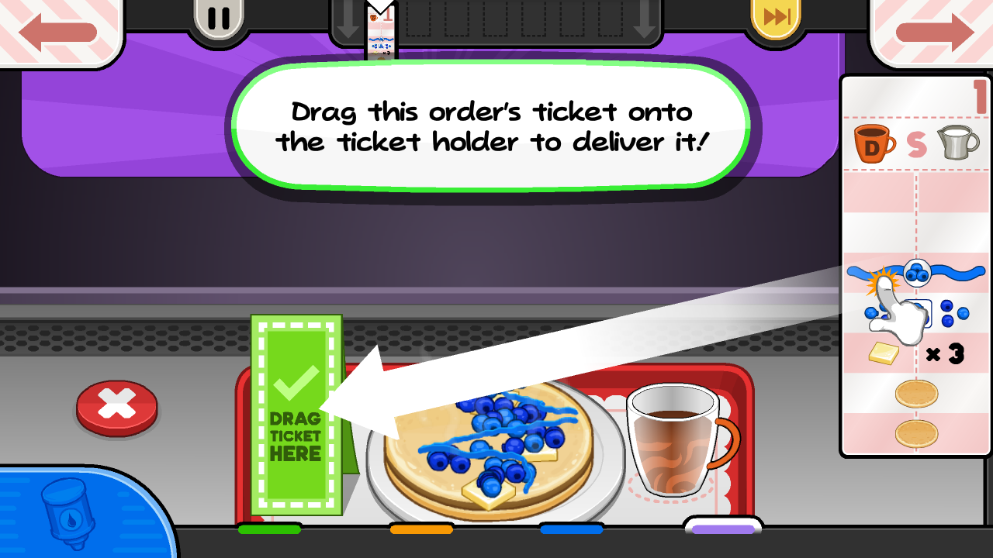 12、饮料做好以后,将饮料放到餐盘中即可,然后我们将右上角的订单按住,拖动到餐盘的左侧放下。