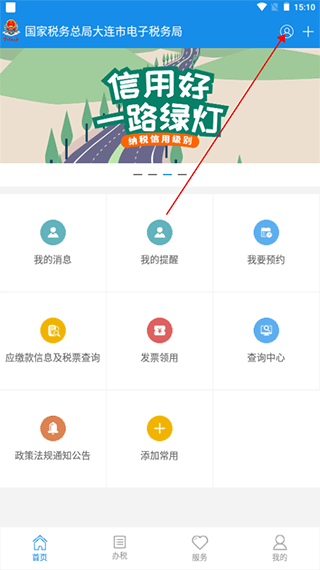 首先下载并安装大连税务APP,在首页可以看到我的消息、提醒及我要预约等选项,点击进入我的页面。