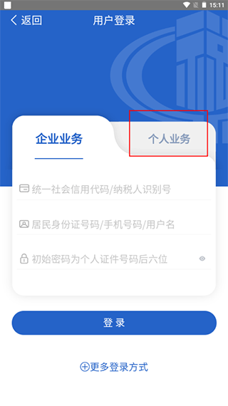 2、进入登录界面,选择个人业务