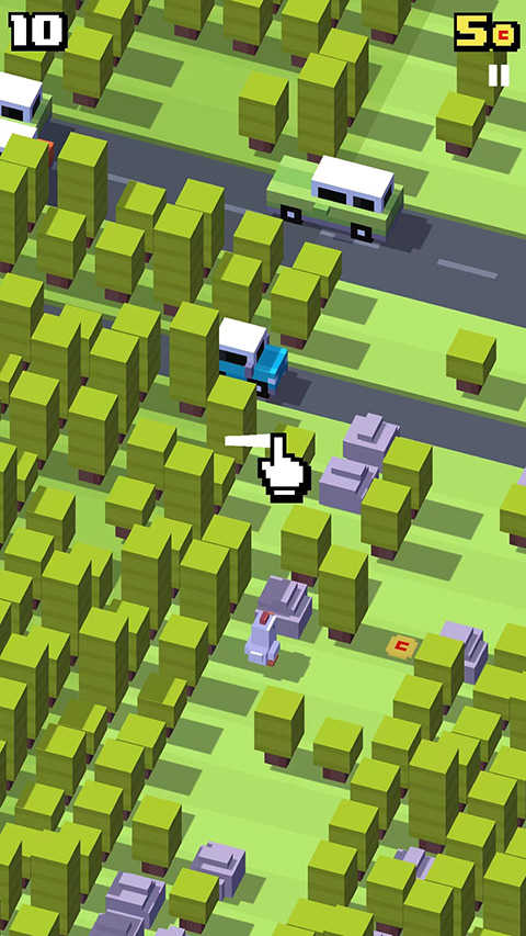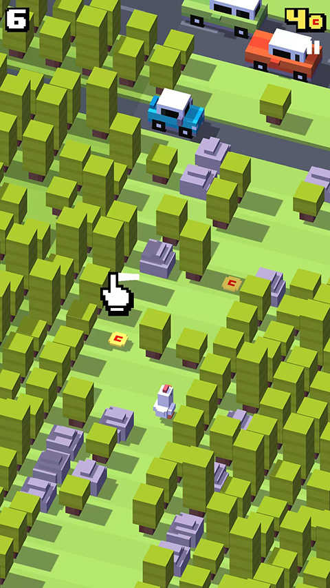 1、游戏为无尽模式,并没有关卡这类的设计,玩家们要帮助主人公横穿马路,并且躲避来回的车辆,手指上下左右滑动屏幕可以控制人物的移动。游戏中玩家们所得到的分数根据人物的行动步数而定,但是只有向前前进一步才会增加一份,左右移动并不会增加分数,当然往回退也不会减少分数。