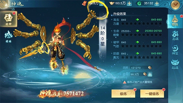 当神魂系统激活,玩家便能开启变身。变身后,玩家可获取全新技能以及属性加成。在日常状态下,玩家能够通过消耗铜币来开展神魂修炼。待修炼属性达到满星时,可借助神魂金丹实现进阶。进阶结束后,又能再次消耗铜币继续进行修炼。