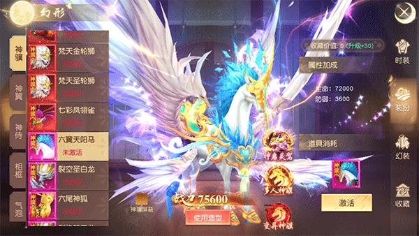 人物幻化系统:人物能够进行幻形的元素包含神衣、神兵、神佑、神迹、称号、坐骑以及神翼等。