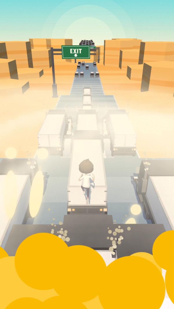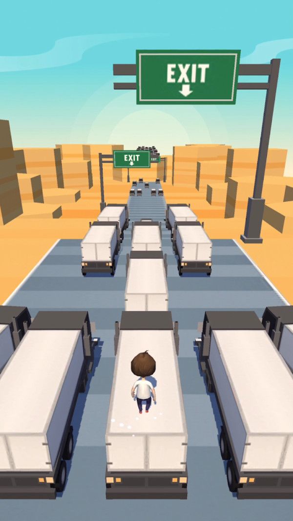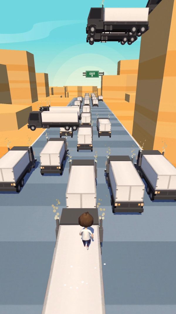 1、游戏的画面十分清晰,你需要操控小男孩在车流中穿行,从一个车顶跳到另一个车顶,不断前进,向终点迈进。