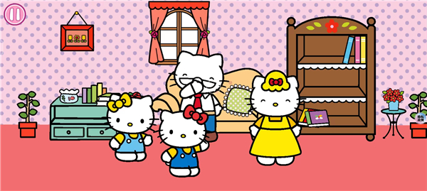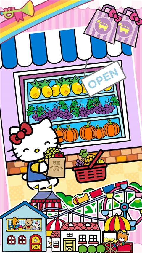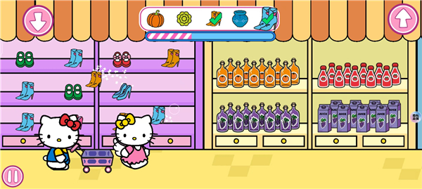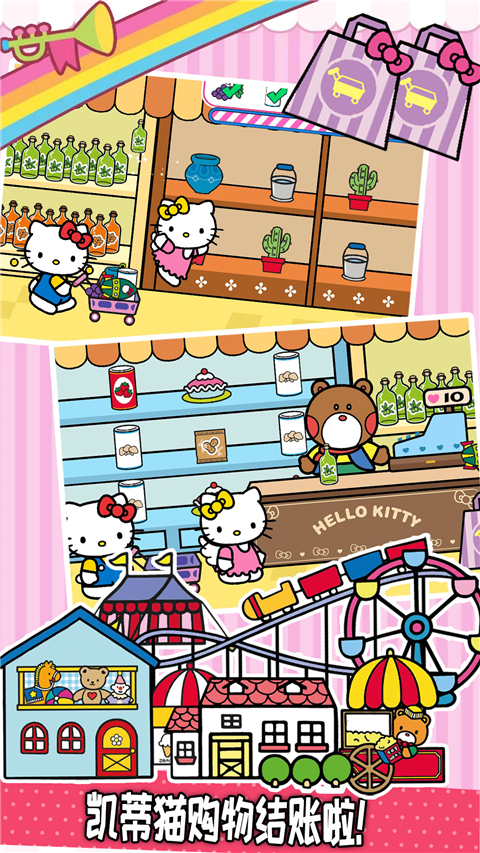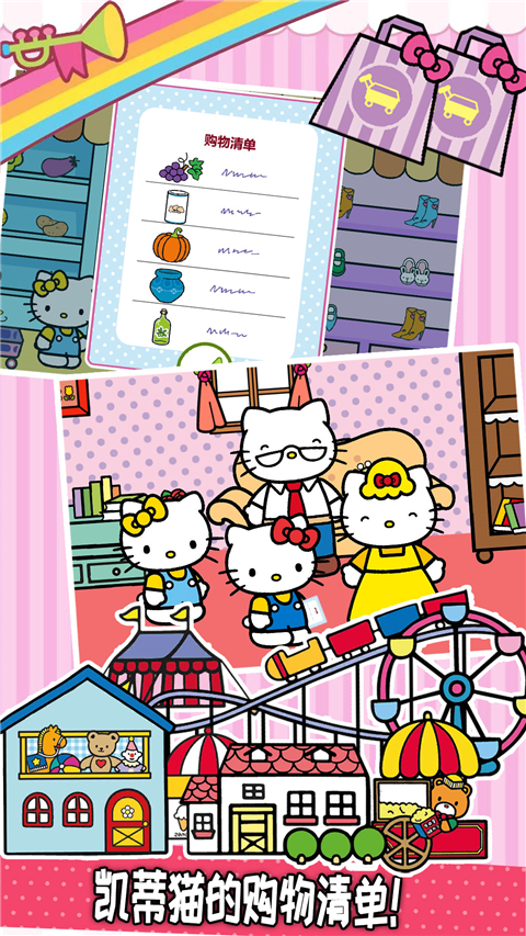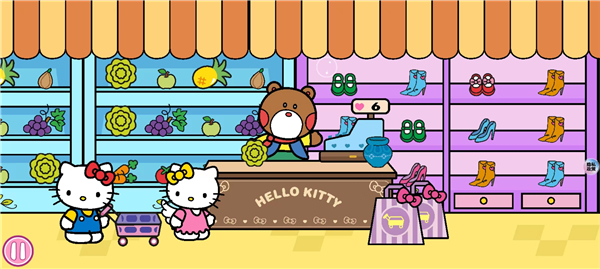 1、卡通游戏风格,精彩有趣的游戏体验,和Hello Kitty和小伙伴一起逛街。