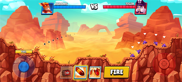进入游戏后,通过滑动左侧的方向键操控坦克移动,到达适当位置时,选择要发射的技能,点击"FIRE"进行射击。