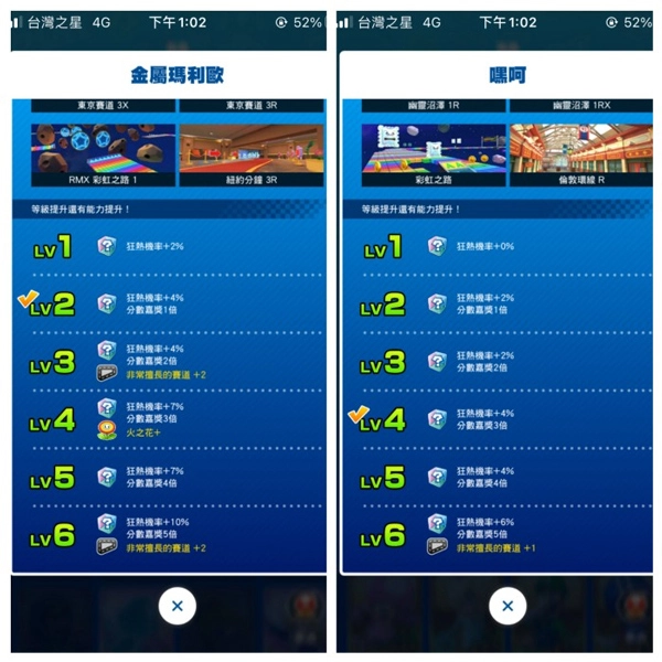 当获取经验值后,赛车手等级会得到提升。收集到特定数量的星星,就能兑换用于升级角色、车辆、滑翔翼的票券,或者解锁分数票券。而且,每个赛道都存在「最擅长的」角色、车辆以及滑翔翼。