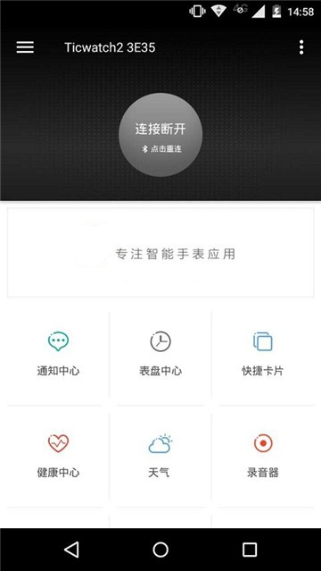 ticwear 助手开发版,这是一款能帮您对电子手表智能设置表盘的工具,能让您给自己的电子手表进行个性化设定变得特别容易,在这里您能轻松选用不同工具来操作,里面包含了通知中心、表盘中心、快捷 nfc、健康天气还有录音等工具模块,您按照自己需要的内容来挑选服务就行。