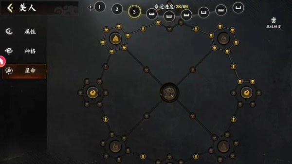 星命能够提升全体武将的属性。星命为所有美人所共享,每个星命页中含有多个星命。星命具体分为普通星命和终极星命这两类。只有激活星命页内的全部普通星命,才能够激活终极星命。而激活终极星命后,不仅可以解锁新的星命页,还能提升美人主动技能的等级,并提高美人等级的上限。