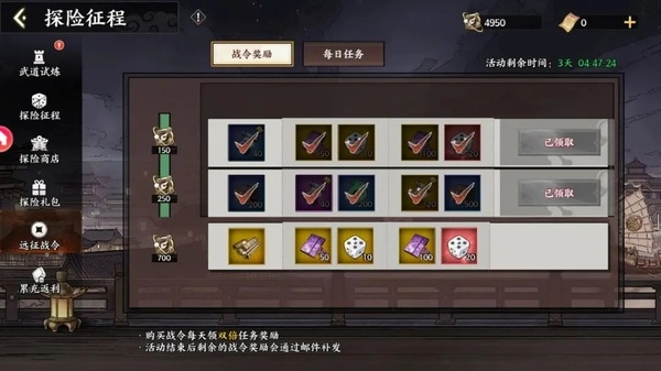 其中包含各类可供兑换的材料,主公凭借在探险征程中获取的活动积分,就能在探险商店里兑换奖励。主公可依据自身需求来选择兑换物品,比如个人推荐优先兑换自选的SP武将或者SSR武将自选,以便继续进行武将升星。