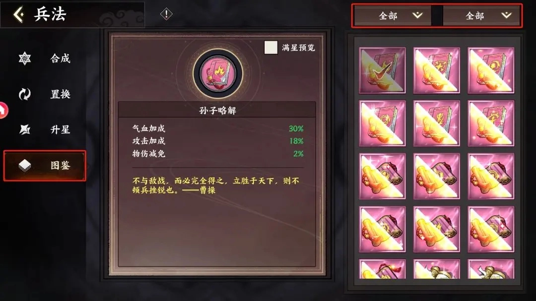 每位武将仅能佩戴5个兵法。兵法类型包含兵书、奇策以及天命这三种,且每个槽位可镶嵌的兵法类型各有不同。此外,兵法由技能与属性这两个部分构成。