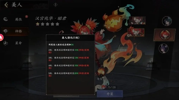 激活神格能够解锁全新的美人形象,还能获取全体增益、全局技能以及主动技能。只要有任意美人出战,所有全局技能便会同时生效,全体武将皆能享受到全体增益的加成。此外,神格支持升星操作,通过升星不仅能够提升技能等级,还可获得全局属性加成。