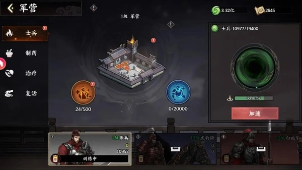 在军营中,可消耗资源来训练士兵。武将携带士兵参与作战,不仅能显著提升武将自身能力,还能对武将起到保护作用,减少其所承受的伤害。需要注意的是,士兵仅能在天下场景中使用。于战斗过程里,士兵会因武将遭受伤害而出现损耗。