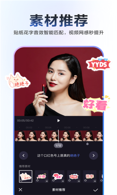 2、内建AI技术,充分利用人工智能算法和数据分析,提供全流程创作工具,快速剪辑和一键包装等特色功能。
