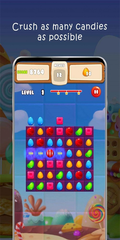 1.在限定的次数或步骤中,将同样的色彩或外形的糖串在一起,使之消失。