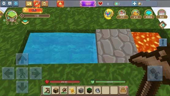 左边的坑是用来放水的,右边的坑是用来放岩浆,划重点:左边的坑第2个格子向下挖2块土地,这样会形成一个阶梯,水会向下流动!