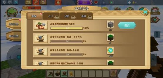 对准树干长按屏幕,即可把树木砍掉并且获得橡木方块,点击右边任务按钮,提交任务,获得奖励