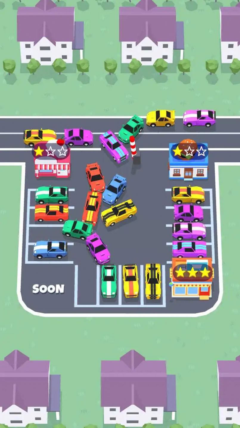 1. 把相同颜色的车辆停在对应颜色的停车位上,完成每个关卡交代的任务。