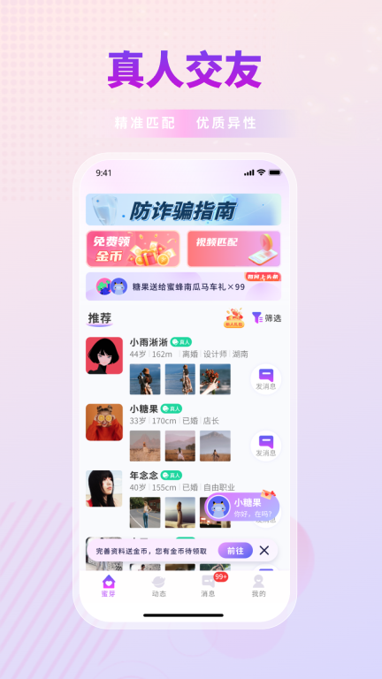 蜜芽交友注重打造一个真实、纯粹的社交环境,在繁忙的都市生活中,寻找一个合适的伴侣往往是一件既期待又挑战的事情,蜜芽APP提供沉浸式交友体验,通过语音、视频等多种方式,让用户能够更加直观地了解对方。