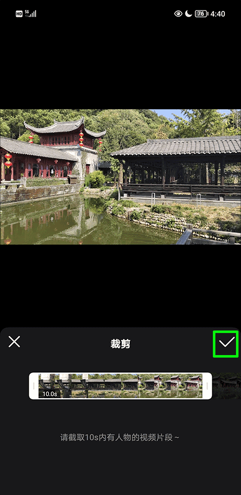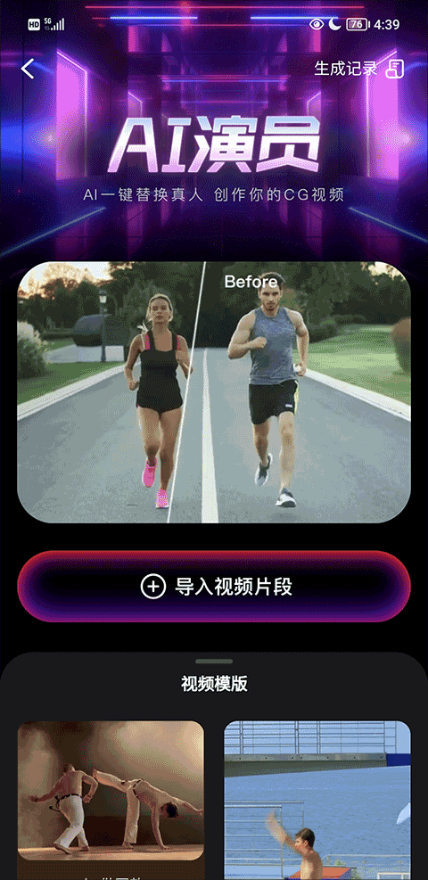 5、此外,用户可以在AI演员界面中,通过点击"导入视频片段"按钮,选择并导入手机中的视频素材进行二次创作。