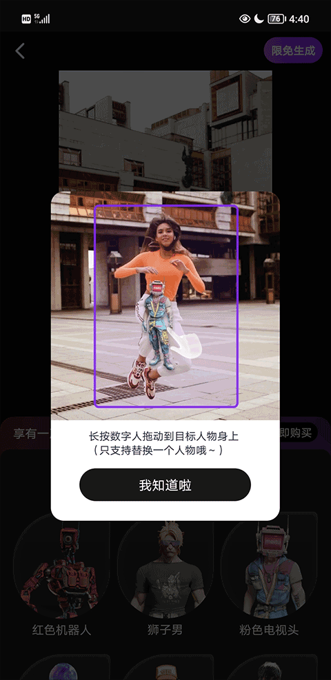 「简单操作」无需专业设备,一台手机轻松搞定,导入视频选中相应人物,即可一键替换真人。
