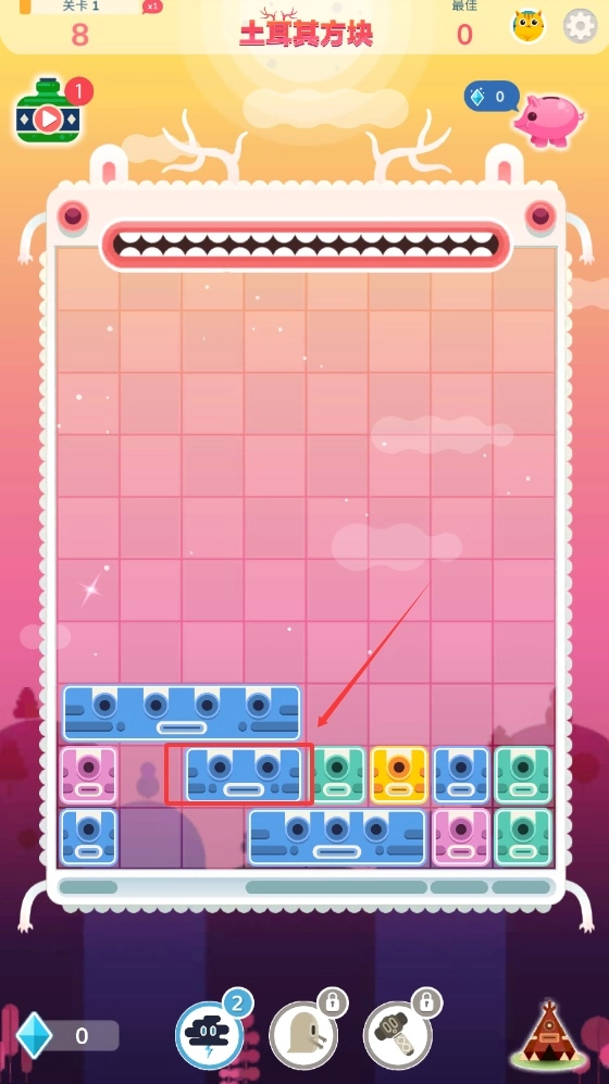 3、选中指定位置的靛蓝积木,然后向左侧轻轻滑动,让它移动到悬空的状态。由于受到重力作用,积木会向下坠落,当它与其他相同颜色的单元接触时,就能实现消解。