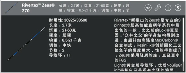 Rivertex Zeus 270(我们称为大270)大270路亚杆是我们后期用的最广泛的路亚杆之一,21-60g的饵重范围,针对中大体型的鱼非常适合,由于杆子长度较长甚至连14g的小饵也能抛投的很远,适用于各种环境下的作钓,总之就是yyds