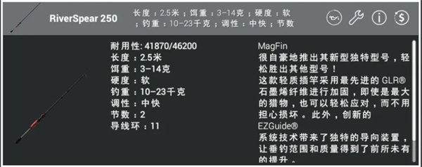 RiverSpear 250这把杆子是一把伴随蒙古地图出的新杆子,它的出现弥补了以往缺少小饵钓大鱼的杆子的缺陷,适合使用10g以内的假饵,拥有良好的抛投距离和钓重