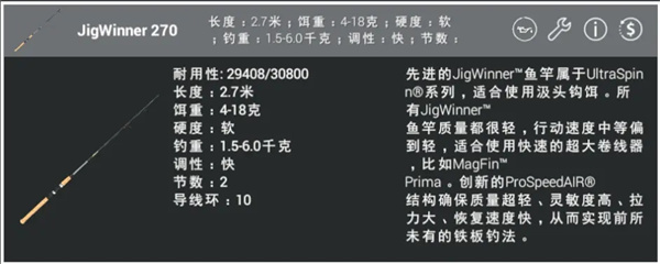 一般后期常用的直柄路亚杆有:JigWinner 270(我们也常称为小270)小270的优点杆长2米7,使用小克重假饵,能抛30-60m适合针对小体型鱼类进行精细化作钓,一般用来作钓4kg以内的鱼,超过4kg则比较吃力。