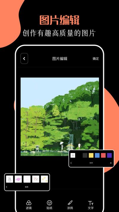 2. 图片编辑更方便,支持滤镜切换,有大量的贴纸和特效,还可以调节字体。