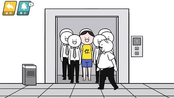 在上班乘坐电梯时遇到了领导,操控人物往里挤了挤,给领导腾出空间。